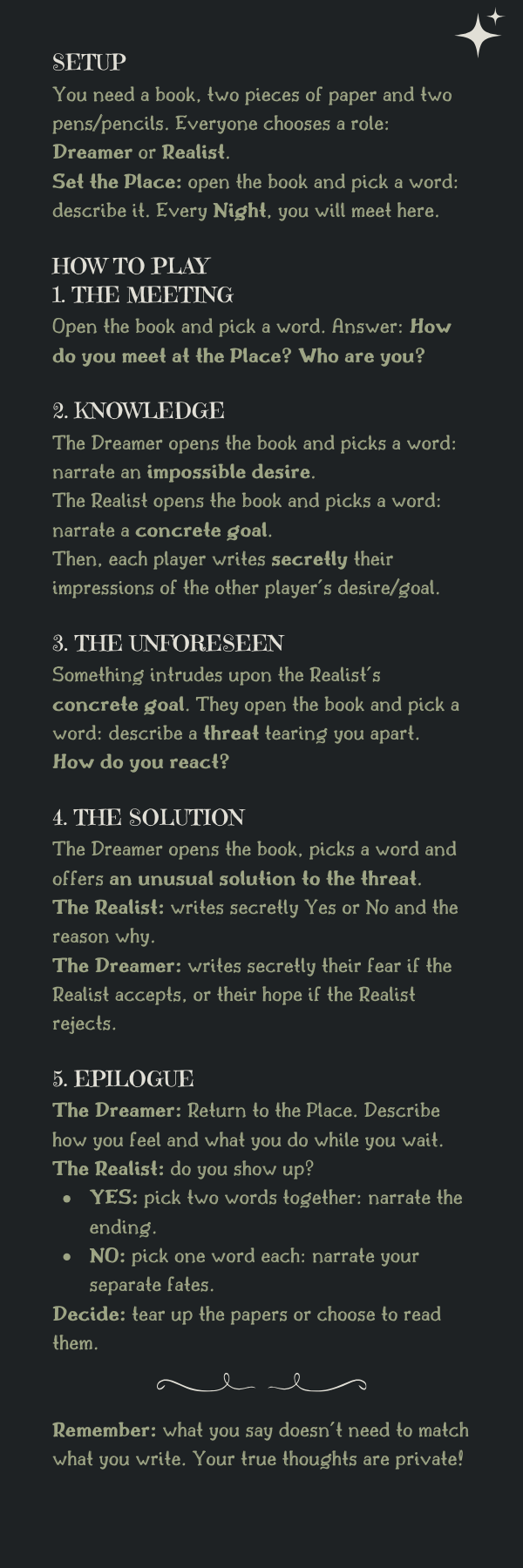 In this game, two strangers meet by chance: one is the Dreamer, the other the Realist. Using a book, you will narrate a short story.